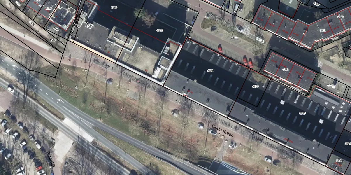 Het perceel waarop Oude Kraan 54 staat heeft een oppervlakte van 1245 m². Dit is een zeer groot perceel. De perceeloppervlakte wordt geregistreerd door het Kadaster. Gedetailleerde informatie over de maten van dit perceel kunt u vinden in het rapport Kadastrale kaart met maatvoering van Oude Kraan 54.