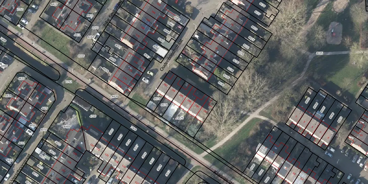 Het perceel waarop Oudenboschstraat 186 staat heeft een oppervlakte van 484 m². Dit is een groot perceel. De perceeloppervlakte wordt geregistreerd door het Kadaster. Gedetailleerde informatie over de maten van dit perceel kunt u vinden in het rapport Kadastrale kaart met maatvoering van Oudenboschstraat 186.