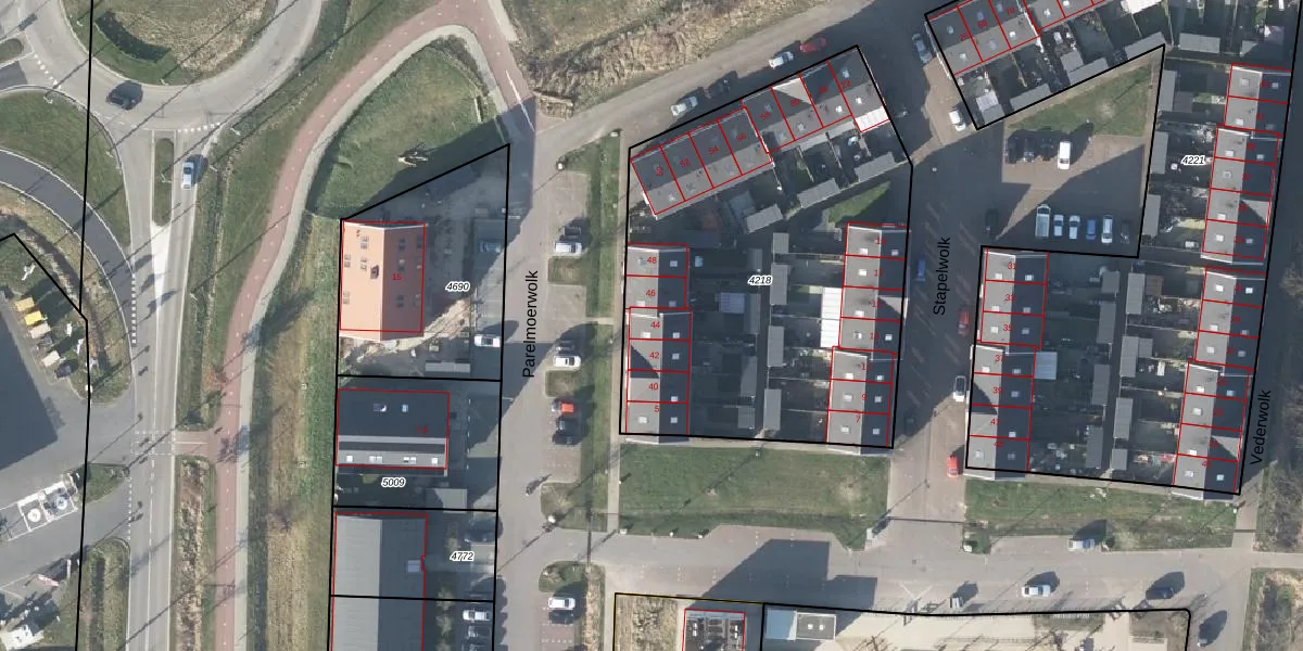 Het perceel waarop Parelmoerwolk 44 staat heeft een oppervlakte van 2245 m². Dit is een zeer groot perceel. De perceeloppervlakte wordt geregistreerd door het Kadaster. Gedetailleerde informatie over de maten van dit perceel kunt u vinden in het rapport Kadastrale kaart met maatvoering van Parelmoerwolk 44.