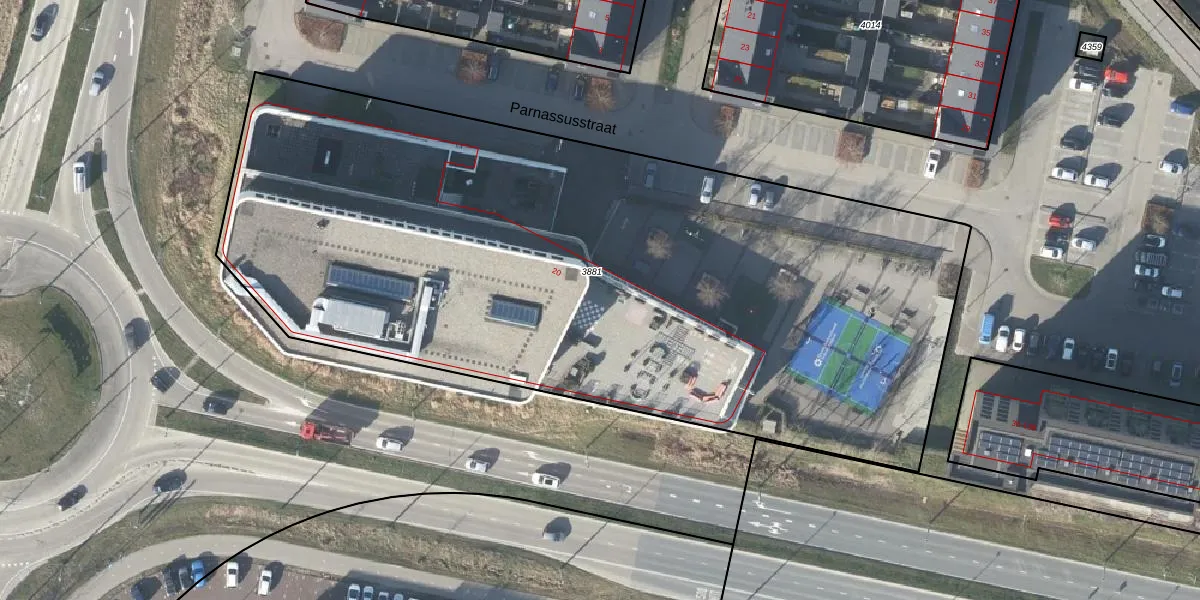 Het perceel waarop Parnassusstraat 20 staat heeft een oppervlakte van 5043 m². Dit is een zeer groot perceel. De perceeloppervlakte wordt geregistreerd door het Kadaster. Gedetailleerde informatie over de maten van dit perceel kunt u vinden in het rapport Kadastrale kaart met maatvoering van Parnassusstraat 20.
