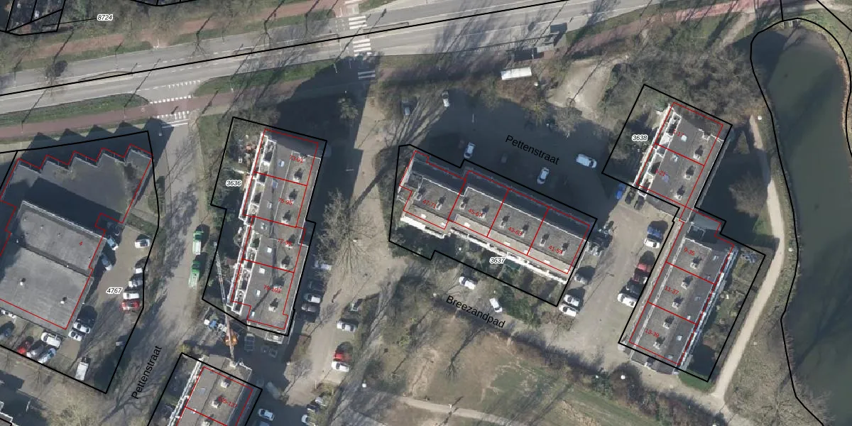 Het perceel waarop Pettenstraat 47 staat heeft een oppervlakte van 1046 m². Dit is een zeer groot perceel. De perceeloppervlakte wordt geregistreerd door het Kadaster. Gedetailleerde informatie over de maten van dit perceel kunt u vinden in het rapport Kadastrale kaart met maatvoering van Pettenstraat 47.