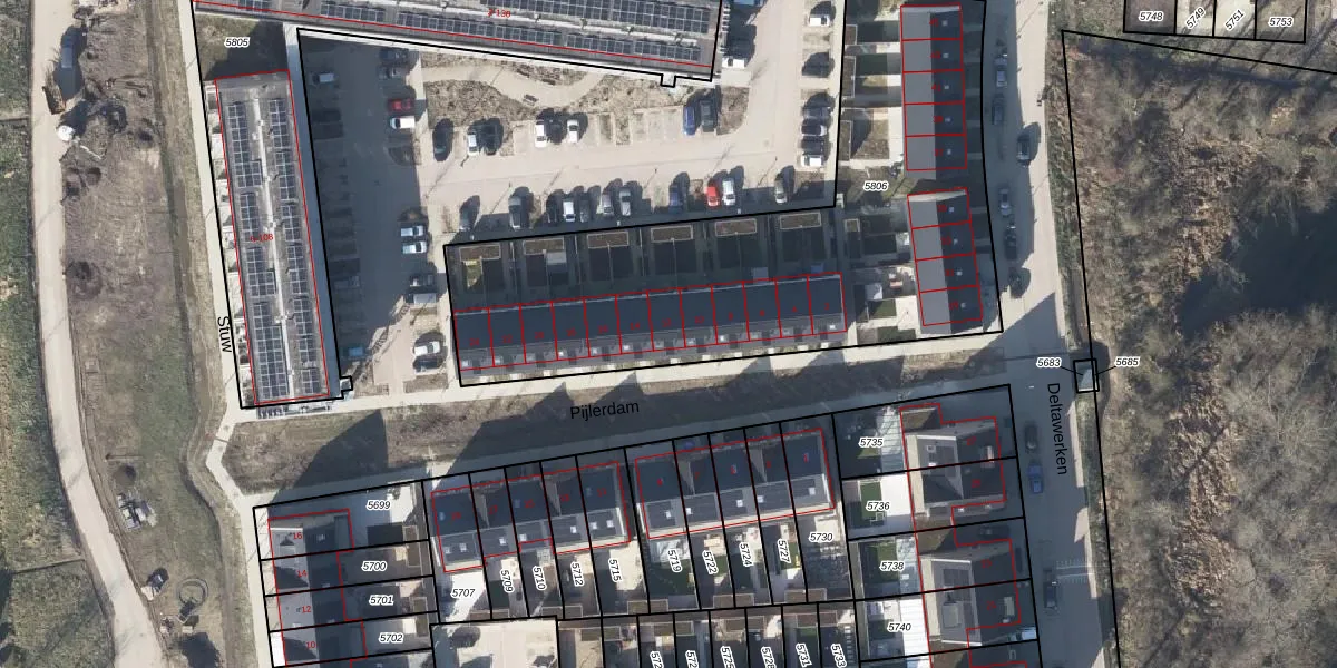 Het perceel waarop Pijlerdam 12 staat heeft een oppervlakte van 2385 m². Dit is een zeer groot perceel. De perceeloppervlakte wordt geregistreerd door het Kadaster. Gedetailleerde informatie over de maten van dit perceel kunt u vinden in het rapport Kadastrale kaart met maatvoering van Pijlerdam 12.