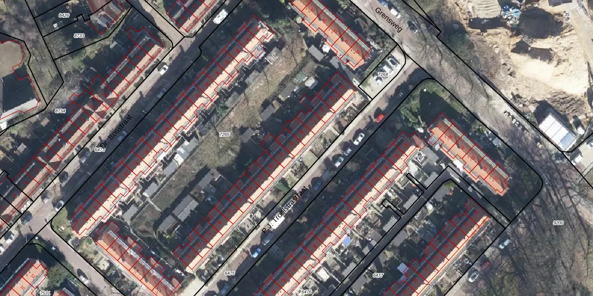 Het perceel waarop P.J. Troelstrastraat 33 staat heeft een oppervlakte van 6645 m². Dit is een zeer groot perceel. De perceeloppervlakte wordt geregistreerd door het Kadaster. Gedetailleerde informatie over de maten van dit perceel kunt u vinden in het rapport Kadastrale kaart met maatvoering van P.J. Troelstrastraat 33.