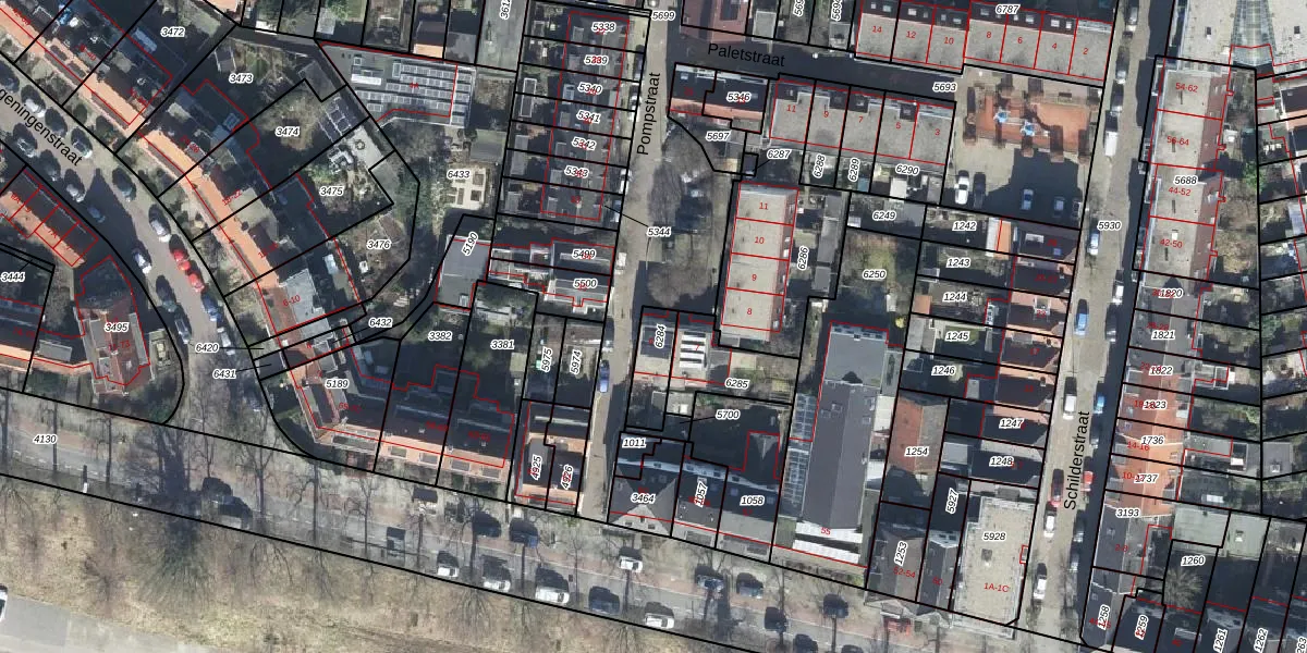 Gebruik de zoekbalk of klik op een perceel voor informatie over de adressen binnen dit perceel.
