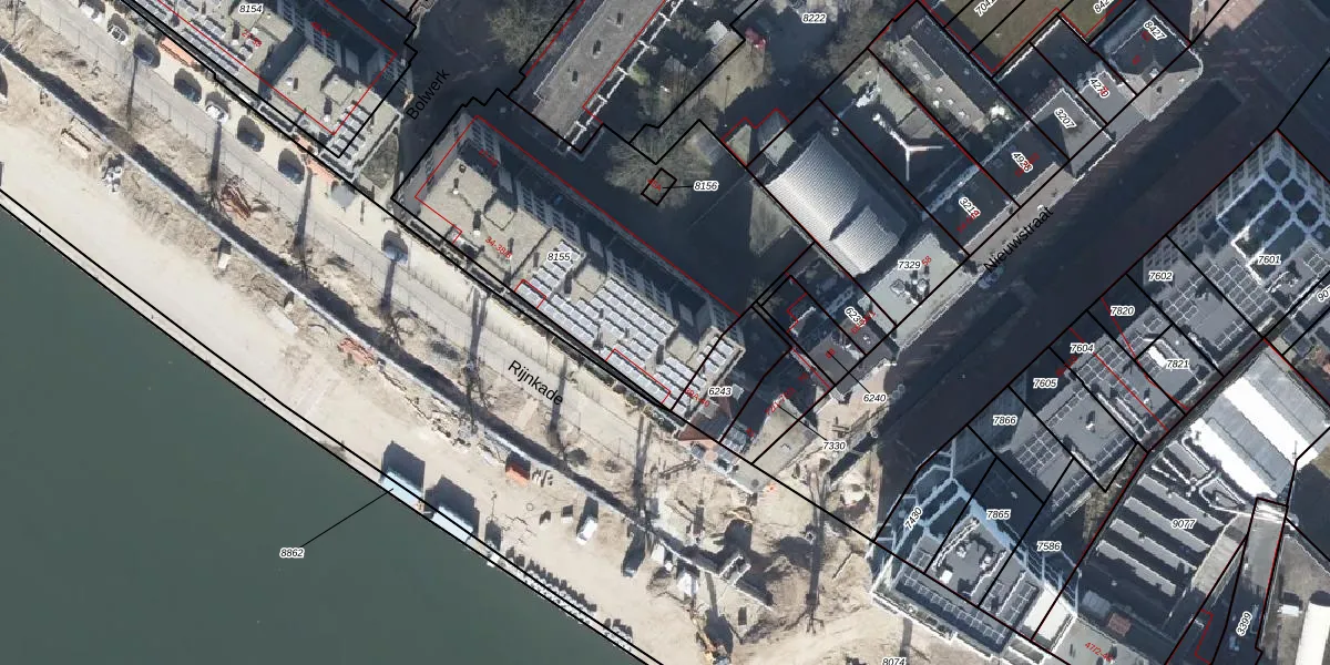 Het perceel waarop Rijnkade 38-8 staat heeft een oppervlakte van 1555 m². Dit is een zeer groot perceel. De perceeloppervlakte wordt geregistreerd door het Kadaster. Gedetailleerde informatie over de maten van dit perceel kunt u vinden in het rapport Kadastrale kaart met maatvoering van Rijnkade 38-8.