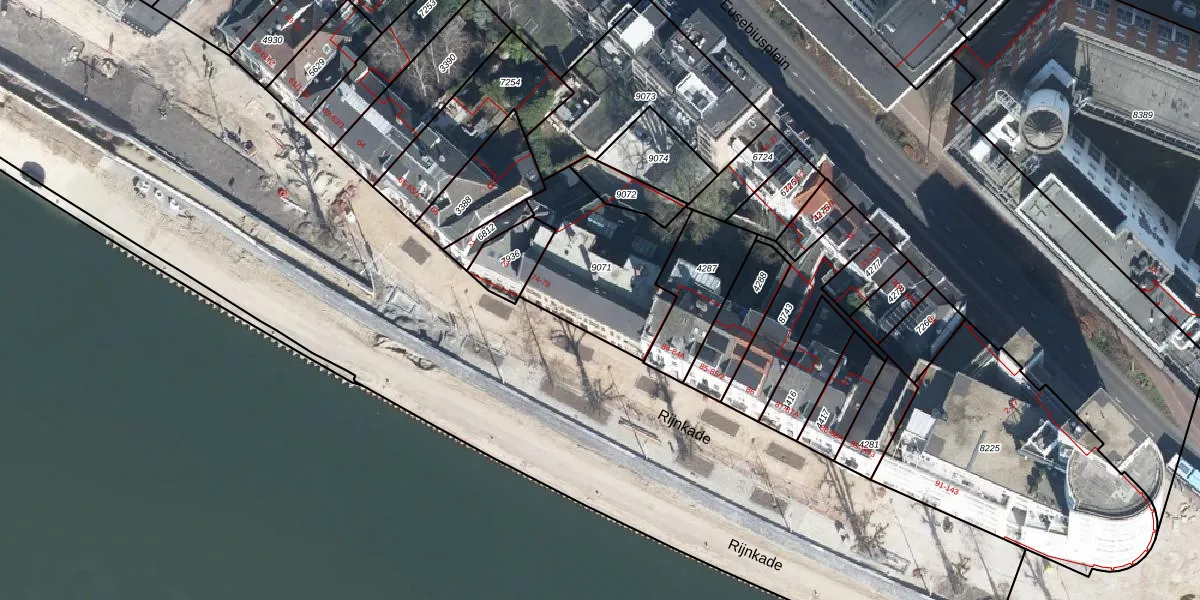 Rijnkade 77 is gelegen op kadastraal perceel AHM01O9071. Deze kadastrale aanduiding is uniek en wordt gebruikt door het Kadaster om eigendomsrechten en andere zakelijke rechten vast te leggen. Het perceel maakt onderdeel uit van de kadastrale gemeente Arnhem.