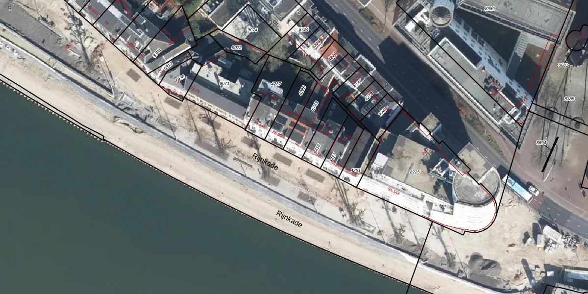 Rijnkade 86 is gelegen op kadastraal perceel AHM01O8743. Deze kadastrale aanduiding is uniek en wordt gebruikt door het Kadaster om eigendomsrechten en andere zakelijke rechten vast te leggen. Het perceel maakt onderdeel uit van de kadastrale gemeente Arnhem.
