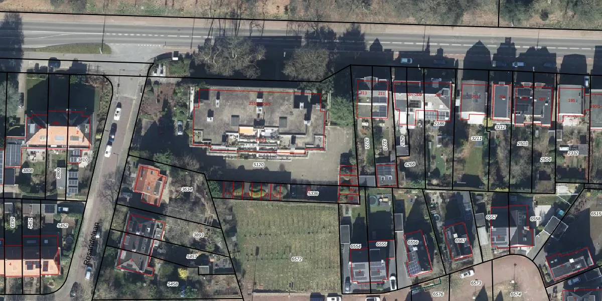 Het perceel waarop Rosandelaan 1-H staat heeft een oppervlakte van 2339 m². Dit is een zeer groot perceel. De perceeloppervlakte wordt geregistreerd door het Kadaster. Gedetailleerde informatie over de maten van dit perceel kunt u vinden in het rapport Kadastrale kaart met maatvoering van Rosandelaan 1-H.