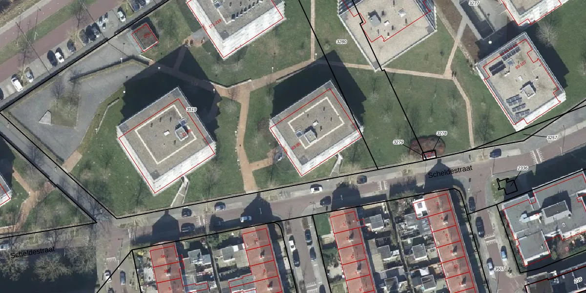 Het perceel waarop Scheldestraat 65 staat heeft een oppervlakte van 6828 m². Dit is een zeer groot perceel. De perceeloppervlakte wordt geregistreerd door het Kadaster. Gedetailleerde informatie over de maten van dit perceel kunt u vinden in het rapport Kadastrale kaart met maatvoering van Scheldestraat 65.