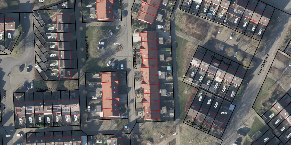 Het perceel waarop Schiedamhof 19 staat heeft een oppervlakte van 2655 m². Dit is een zeer groot perceel. De perceeloppervlakte wordt geregistreerd door het Kadaster. Gedetailleerde informatie over de maten van dit perceel kunt u vinden in het rapport Kadastrale kaart met maatvoering van Schiedamhof 19.