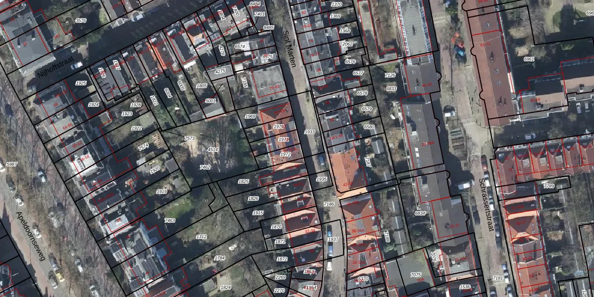 Het perceel waarop Sint Marten 57 staat heeft een oppervlakte van 80 m². Dit is een klein perceel. De perceeloppervlakte wordt geregistreerd door het Kadaster. Gedetailleerde informatie over de maten van dit perceel kunt u vinden in het rapport Kadastrale kaart met maatvoering van Sint Marten 57.