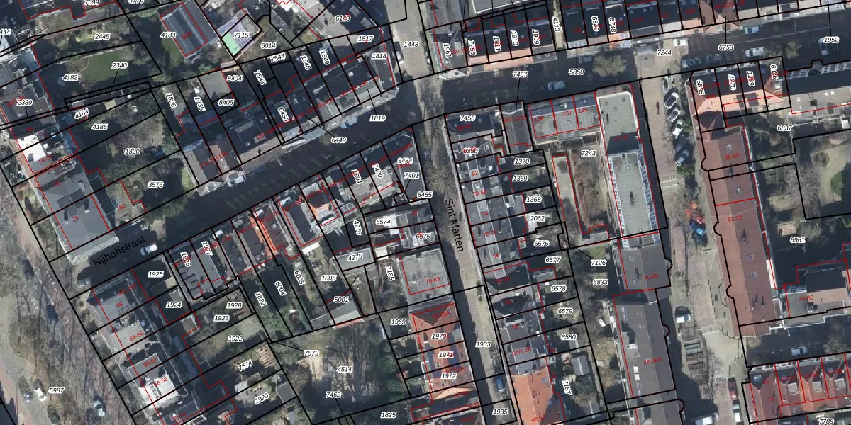 Het perceel waarop Sint Marten 87 staat heeft een oppervlakte van 80 m². Dit is een klein perceel. De perceeloppervlakte wordt geregistreerd door het Kadaster. Gedetailleerde informatie over de maten van dit perceel kunt u vinden in het rapport Kadastrale kaart met maatvoering van Sint Marten 87.