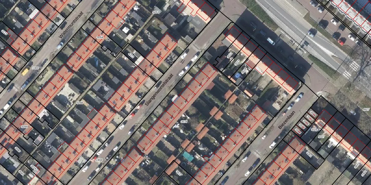 Het perceel waarop Slangenwortelstraat 7 staat heeft een oppervlakte van 5149 m². Dit is een zeer groot perceel. De perceeloppervlakte wordt geregistreerd door het Kadaster. Gedetailleerde informatie over de maten van dit perceel kunt u vinden in het rapport Kadastrale kaart met maatvoering van Slangenwortelstraat 7.