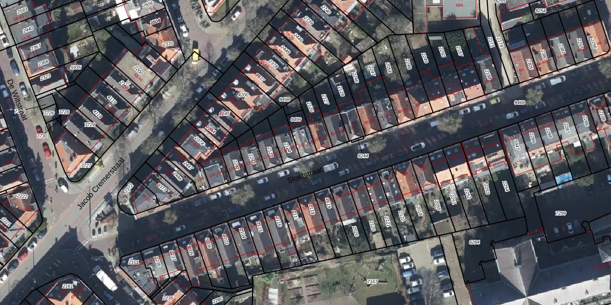 Het perceel waarop Sloetstraat 112 staat heeft een oppervlakte van 83 m². Dit is een klein perceel. De perceeloppervlakte wordt geregistreerd door het Kadaster. Gedetailleerde informatie over de maten van dit perceel kunt u vinden in het rapport Kadastrale kaart met maatvoering van Sloetstraat 112.