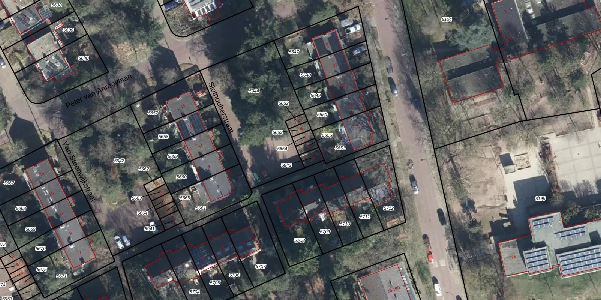 Het perceel waarop Slothouberstraat 4 staat heeft een oppervlakte van 22 m². Dit is een klein perceel. De perceeloppervlakte wordt geregistreerd door het Kadaster. Gedetailleerde informatie over de maten van dit perceel kunt u vinden in het rapport Kadastrale kaart met maatvoering van Slothouberstraat 4.