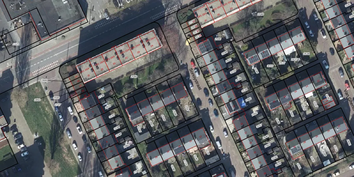 Gebruik de zoekbalk of klik op een perceel voor informatie over de adressen binnen dit perceel.