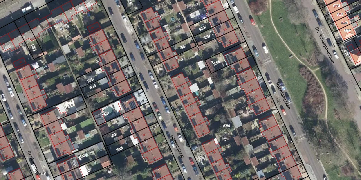 Het perceel waarop Spechtstraat 30 staat heeft een oppervlakte van 7738 m². Dit is een zeer groot perceel. De perceeloppervlakte wordt geregistreerd door het Kadaster. Gedetailleerde informatie over de maten van dit perceel kunt u vinden in het rapport Kadastrale kaart met maatvoering van Spechtstraat 30.