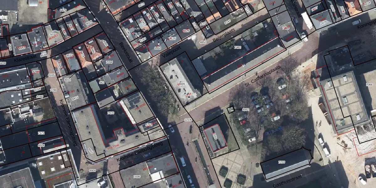 Het perceel waarop St. Catharinaplaats 16 staat heeft een oppervlakte van 389 m². Dit is een groot perceel. De perceeloppervlakte wordt geregistreerd door het Kadaster. Gedetailleerde informatie over de maten van dit perceel kunt u vinden in het rapport Kadastrale kaart met maatvoering van St. Catharinaplaats 16.