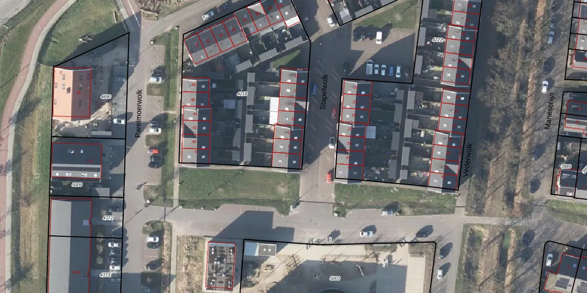 Het perceel waarop Stapelwolk 9 staat heeft een oppervlakte van 2245 m². Dit is een zeer groot perceel. De perceeloppervlakte wordt geregistreerd door het Kadaster. Gedetailleerde informatie over de maten van dit perceel kunt u vinden in het rapport Kadastrale kaart met maatvoering van Stapelwolk 9.