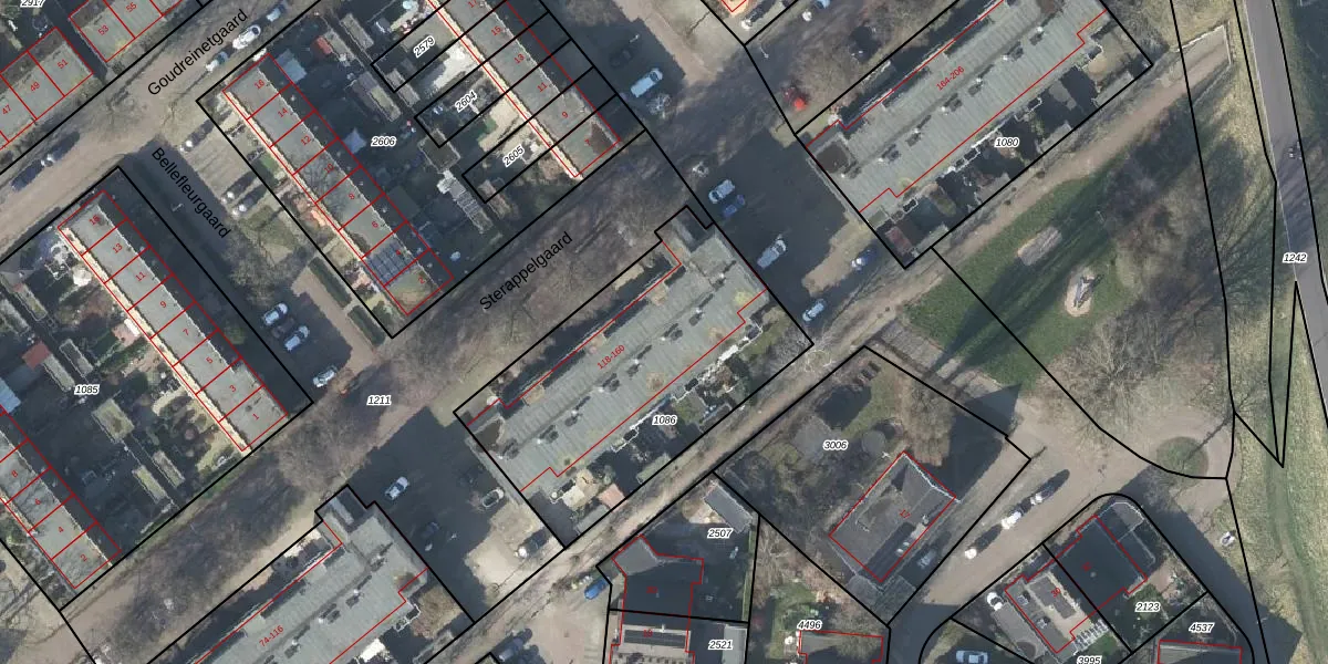 Het perceel waarop Sterappelgaard 156 staat heeft een oppervlakte van 1291 m². Dit is een zeer groot perceel. De perceeloppervlakte wordt geregistreerd door het Kadaster. Gedetailleerde informatie over de maten van dit perceel kunt u vinden in het rapport Kadastrale kaart met maatvoering van Sterappelgaard 156.