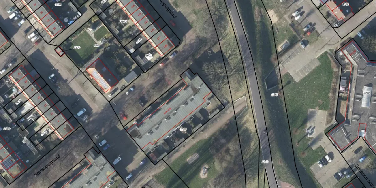 Het perceel waarop Sterappelgaard 188 staat heeft een oppervlakte van 1275 m². Dit is een zeer groot perceel. De perceeloppervlakte wordt geregistreerd door het Kadaster. Gedetailleerde informatie over de maten van dit perceel kunt u vinden in het rapport Kadastrale kaart met maatvoering van Sterappelgaard 188.