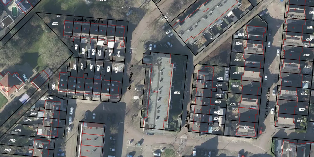 Het perceel waarop Sterappelgaard 52 staat heeft een oppervlakte van 1252 m². Dit is een zeer groot perceel. De perceeloppervlakte wordt geregistreerd door het Kadaster. Gedetailleerde informatie over de maten van dit perceel kunt u vinden in het rapport Kadastrale kaart met maatvoering van Sterappelgaard 52.