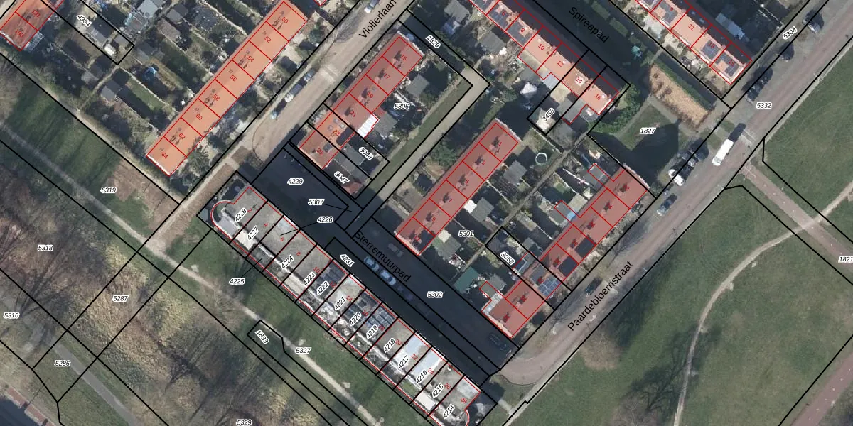 Het perceel waarop Sterremuurpad 9 staat heeft een oppervlakte van 2904 m². Dit is een zeer groot perceel. De perceeloppervlakte wordt geregistreerd door het Kadaster. Gedetailleerde informatie over de maten van dit perceel kunt u vinden in het rapport Kadastrale kaart met maatvoering van Sterremuurpad 9.