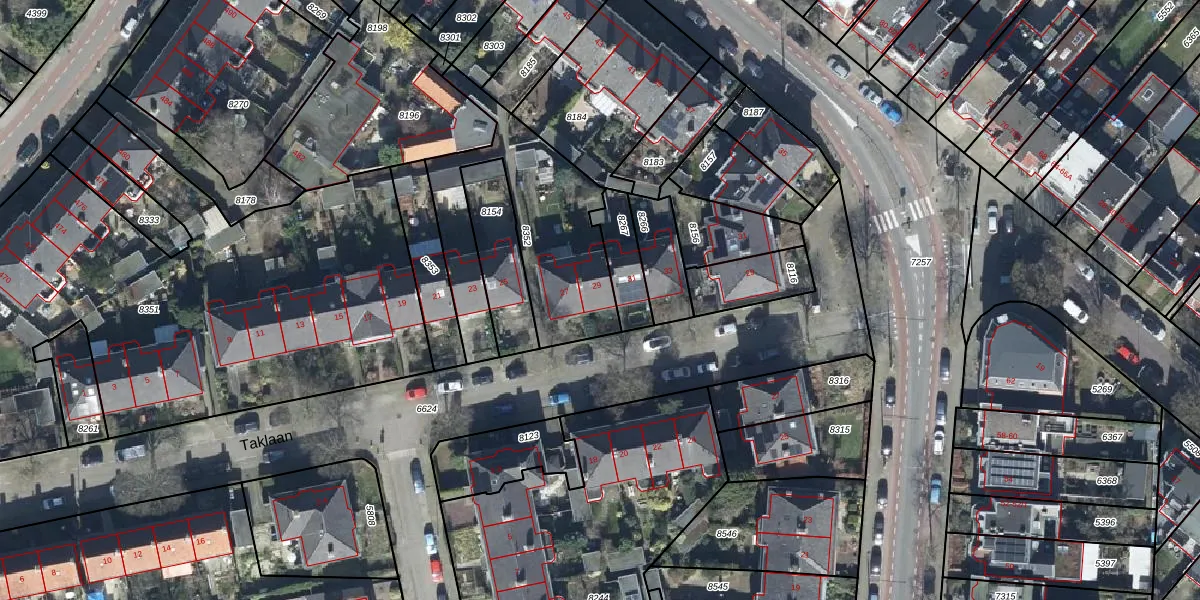 Taklaan 29 is gelegen op kadastraal perceel AHM01R8352. Deze kadastrale aanduiding is uniek en wordt gebruikt door het Kadaster om eigendomsrechten en andere zakelijke rechten vast te leggen. Het perceel maakt onderdeel uit van de kadastrale gemeente Arnhem.