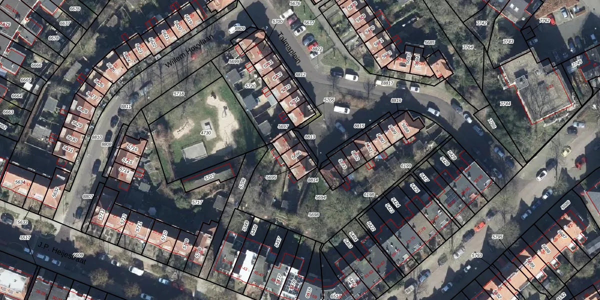 Het perceel waarop Talmaplein 9 staat heeft een oppervlakte van 40 m². Dit is een klein perceel. De perceeloppervlakte wordt geregistreerd door het Kadaster. Gedetailleerde informatie over de maten van dit perceel kunt u vinden in het rapport Kadastrale kaart met maatvoering van Talmaplein 9.