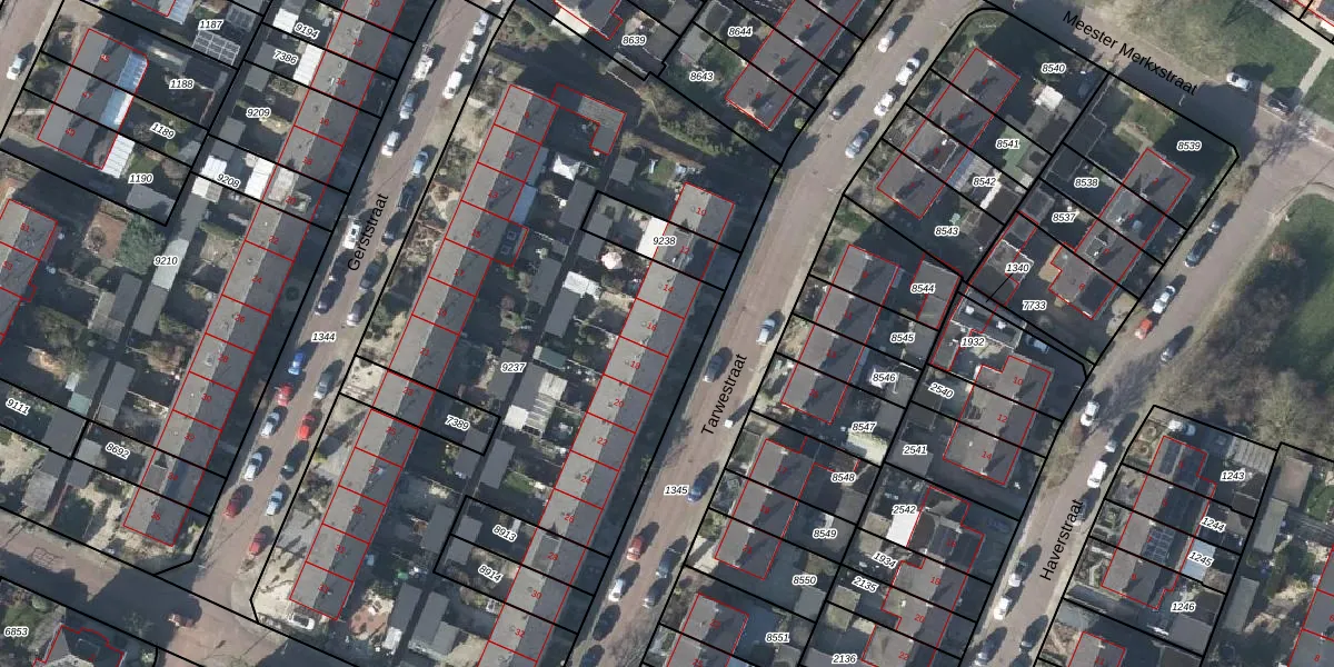 Het perceel waarop Tarwestraat 16 staat heeft een oppervlakte van 4046 m². Dit is een zeer groot perceel. De perceeloppervlakte wordt geregistreerd door het Kadaster. Gedetailleerde informatie over de maten van dit perceel kunt u vinden in het rapport Kadastrale kaart met maatvoering van Tarwestraat 16.