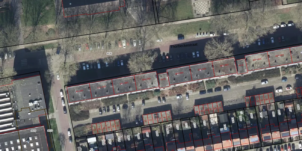 Het perceel waarop Thorbeckestraat 22-1 staat heeft een oppervlakte van 6394 m². Dit is een zeer groot perceel. De perceeloppervlakte wordt geregistreerd door het Kadaster. Gedetailleerde informatie over de maten van dit perceel kunt u vinden in het rapport Kadastrale kaart met maatvoering van Thorbeckestraat 22-1.