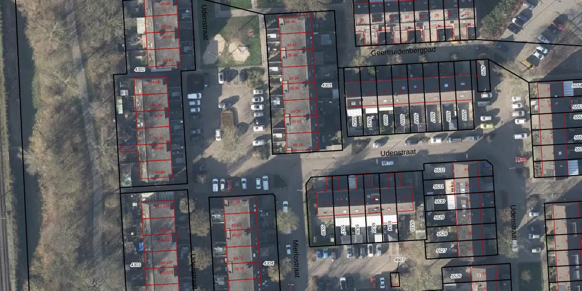 Udenstraat 16 is gelegen op kadastraal perceel AHM03AC4301. Deze kadastrale aanduiding is uniek en wordt gebruikt door het Kadaster om eigendomsrechten en andere zakelijke rechten vast te leggen. Het perceel maakt onderdeel uit van de kadastrale gemeente Arnhem.