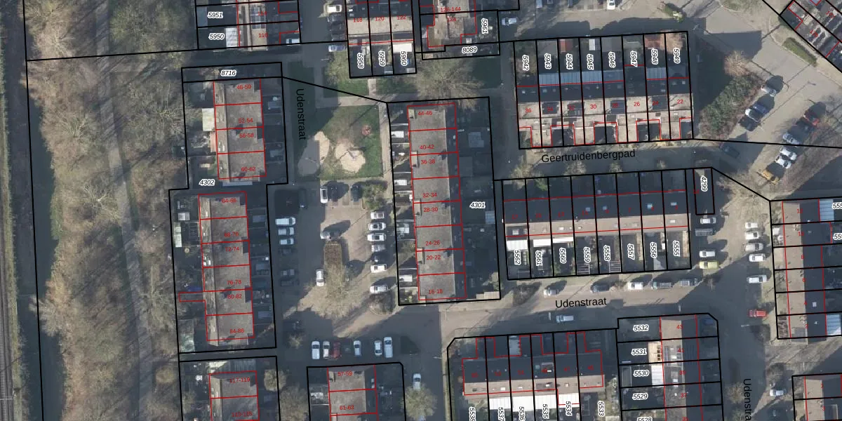 Het perceel waarop Udenstraat 30 staat heeft een oppervlakte van 1165 m². Dit is een zeer groot perceel. De perceeloppervlakte wordt geregistreerd door het Kadaster. Gedetailleerde informatie over de maten van dit perceel kunt u vinden in het rapport Kadastrale kaart met maatvoering van Udenstraat 30.