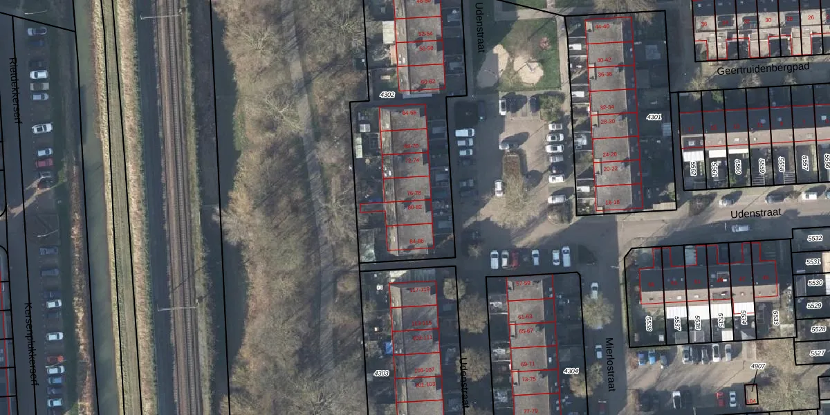 Udenstraat 82 is gelegen op kadastraal perceel AHM03AC4302. Deze kadastrale aanduiding is uniek en wordt gebruikt door het Kadaster om eigendomsrechten en andere zakelijke rechten vast te leggen. Het perceel maakt onderdeel uit van de kadastrale gemeente Arnhem.