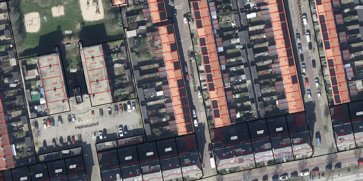 Het perceel waarop Van Beuningenstraat 26 staat heeft een oppervlakte van 2297 m². Dit is een zeer groot perceel. De perceeloppervlakte wordt geregistreerd door het Kadaster. Gedetailleerde informatie over de maten van dit perceel kunt u vinden in het rapport Kadastrale kaart met maatvoering van Van Beuningenstraat 26.