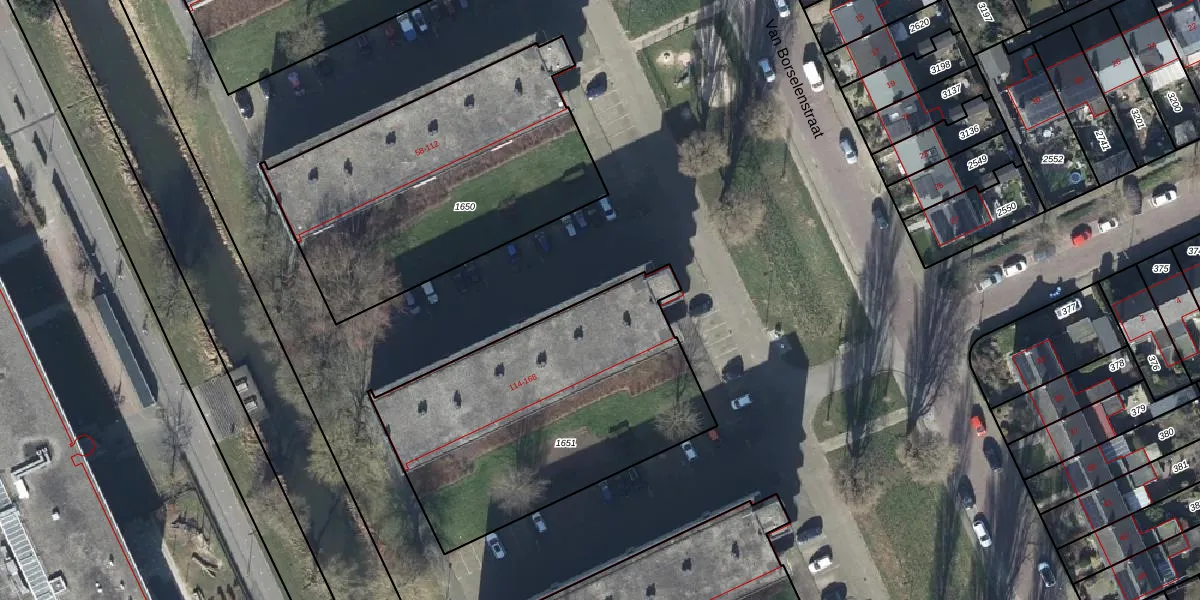 Het perceel waarop Van Borselenstraat 114-B staat heeft een oppervlakte van 1440 m². Dit is een zeer groot perceel. De perceeloppervlakte wordt geregistreerd door het Kadaster. Gedetailleerde informatie over de maten van dit perceel kunt u vinden in het rapport Kadastrale kaart met maatvoering van Van Borselenstraat 114-B.
