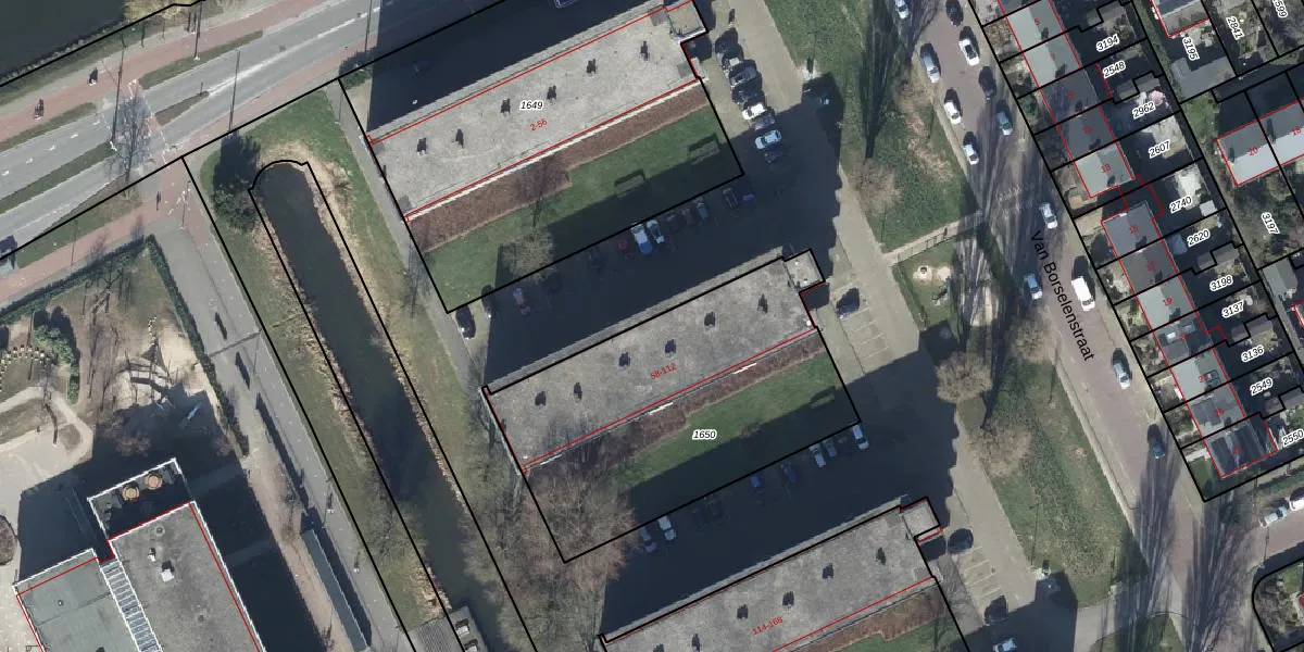 Het perceel waarop Van Borselenstraat 58-F staat heeft een oppervlakte van 1430 m². Dit is een zeer groot perceel. De perceeloppervlakte wordt geregistreerd door het Kadaster. Gedetailleerde informatie over de maten van dit perceel kunt u vinden in het rapport Kadastrale kaart met maatvoering van Van Borselenstraat 58-F.