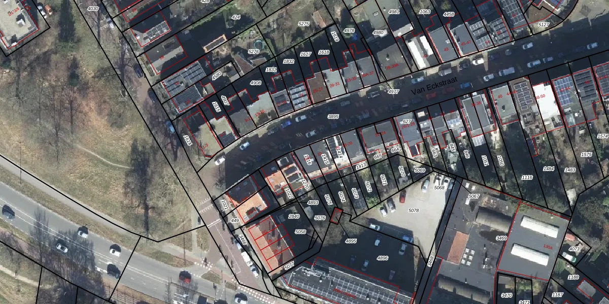 Het perceel waarop Van Eckstraat 6 staat heeft een oppervlakte van 81 m². Dit is een klein perceel. De perceeloppervlakte wordt geregistreerd door het Kadaster. Gedetailleerde informatie over de maten van dit perceel kunt u vinden in het rapport Kadastrale kaart met maatvoering van Van Eckstraat 6.