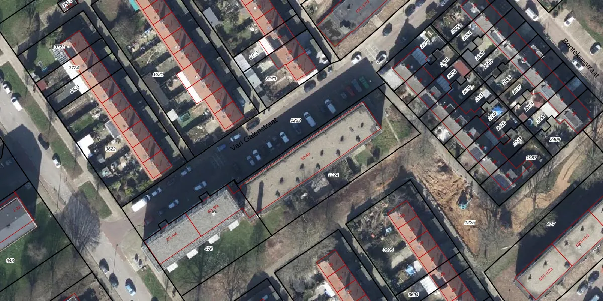 Het perceel waarop Van Galenstraat 24 staat heeft een oppervlakte van 1196 m². Dit is een zeer groot perceel. De perceeloppervlakte wordt geregistreerd door het Kadaster. Gedetailleerde informatie over de maten van dit perceel kunt u vinden in het rapport Kadastrale kaart met maatvoering van Van Galenstraat 24.