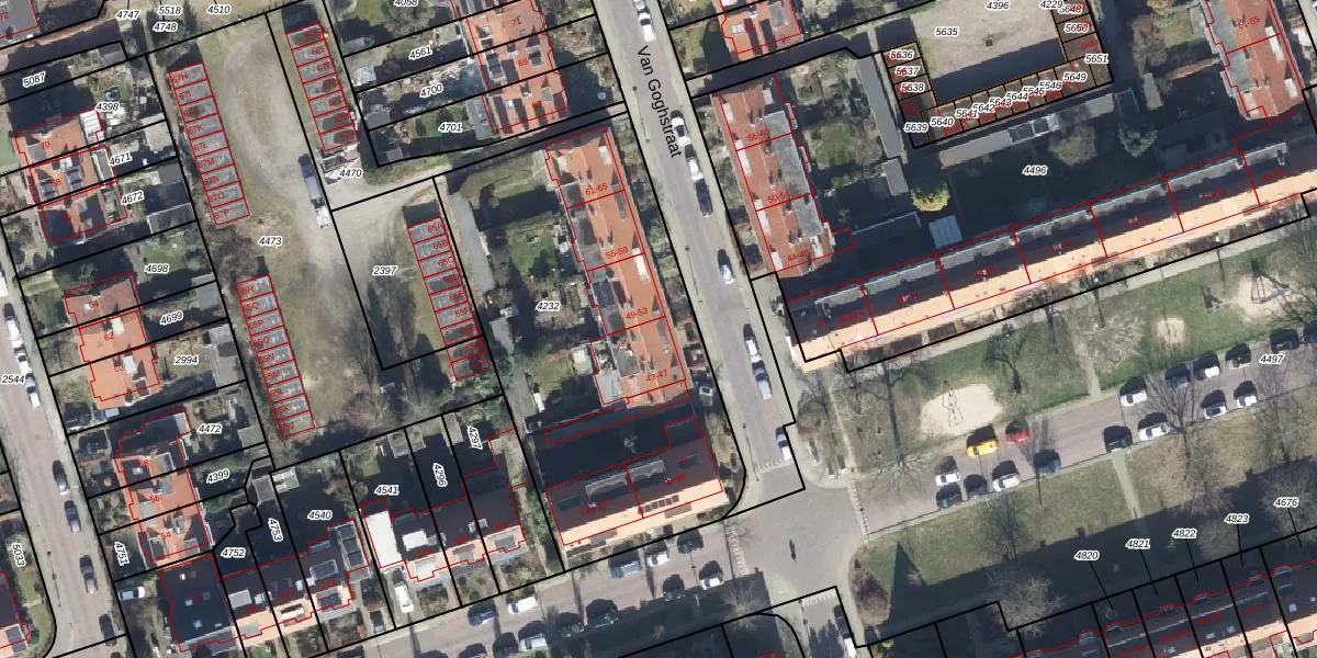 Het perceel waarop Van Goghstraat 47 staat heeft een oppervlakte van 1946 m². Dit is een zeer groot perceel. De perceeloppervlakte wordt geregistreerd door het Kadaster. Gedetailleerde informatie over de maten van dit perceel kunt u vinden in het rapport Kadastrale kaart met maatvoering van Van Goghstraat 47.