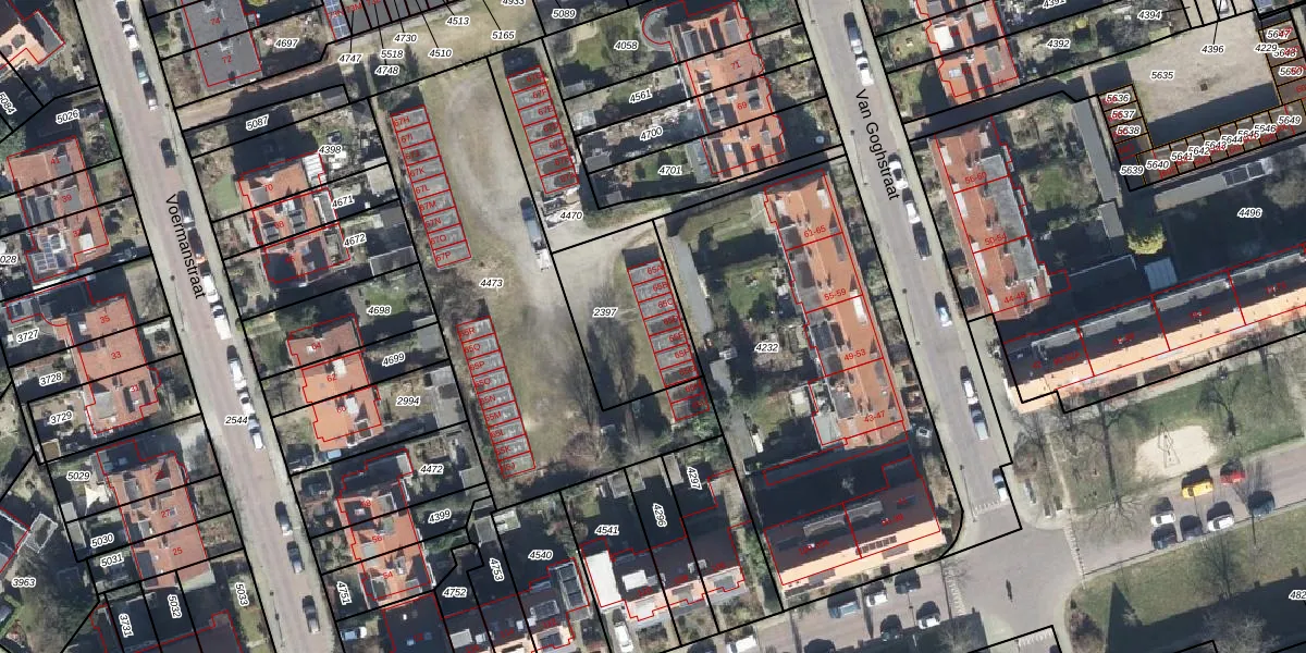 Het perceel waarop Van Goghstraat 65-D staat heeft een oppervlakte van 414 m². Dit is een groot perceel. De perceeloppervlakte wordt geregistreerd door het Kadaster. Gedetailleerde informatie over de maten van dit perceel kunt u vinden in het rapport Kadastrale kaart met maatvoering van Van Goghstraat 65-D.