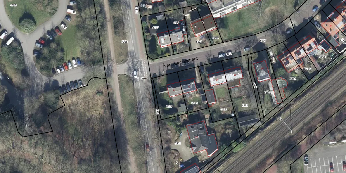 Het perceel waarop Van Huevenstraat 6 staat heeft een oppervlakte van 377 m². Dit is een groot perceel. De perceeloppervlakte wordt geregistreerd door het Kadaster. Gedetailleerde informatie over de maten van dit perceel kunt u vinden in het rapport Kadastrale kaart met maatvoering van Van Huevenstraat 6.