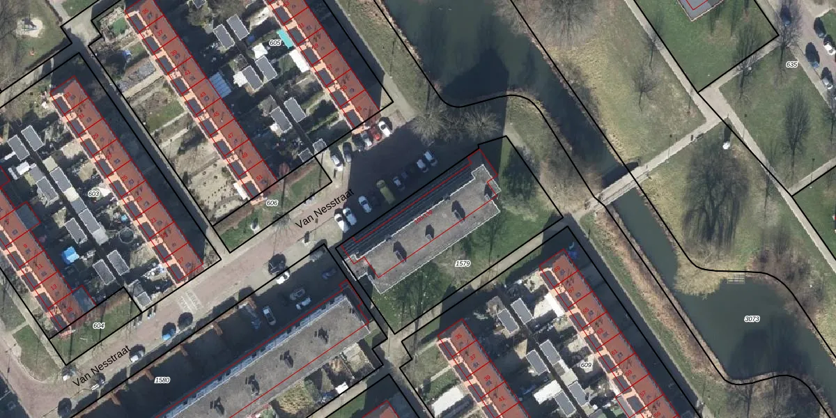 Het perceel waarop Van Nesstraat 112 staat heeft een oppervlakte van 1187 m². Dit is een zeer groot perceel. De perceeloppervlakte wordt geregistreerd door het Kadaster. Gedetailleerde informatie over de maten van dit perceel kunt u vinden in het rapport Kadastrale kaart met maatvoering van Van Nesstraat 112.