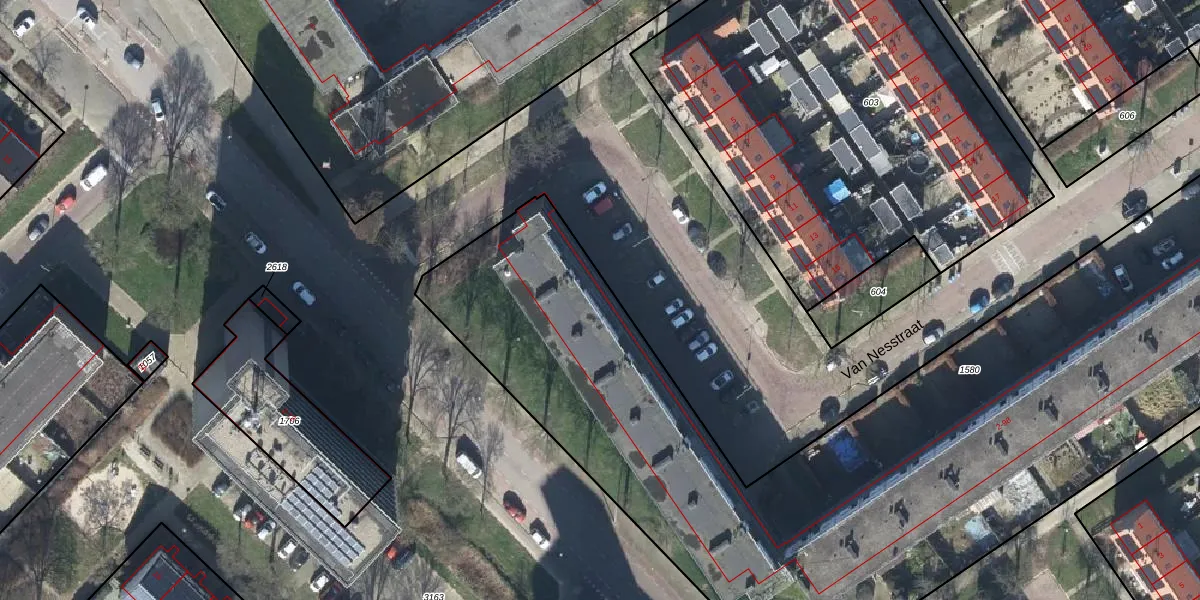 Het perceel waarop Van Nesstraat 2-K staat heeft een oppervlakte van 4735 m². Dit is een zeer groot perceel. De perceeloppervlakte wordt geregistreerd door het Kadaster. Gedetailleerde informatie over de maten van dit perceel kunt u vinden in het rapport Kadastrale kaart met maatvoering van Van Nesstraat 2-K.