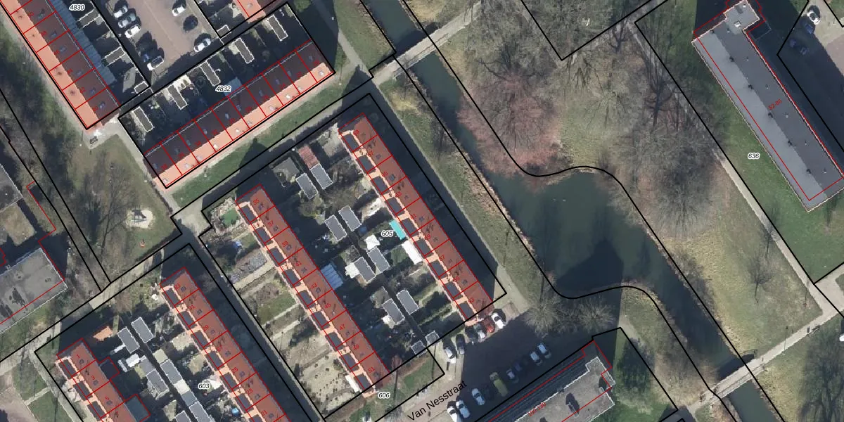 Het perceel waarop Van Nesstraat 61 staat heeft een oppervlakte van 2999 m². Dit is een zeer groot perceel. De perceeloppervlakte wordt geregistreerd door het Kadaster. Gedetailleerde informatie over de maten van dit perceel kunt u vinden in het rapport Kadastrale kaart met maatvoering van Van Nesstraat 61.