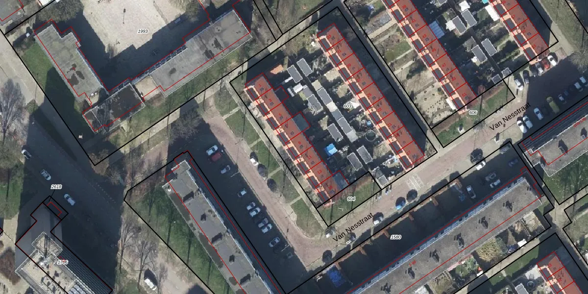 Het perceel waarop Van Nesstraat 9 staat heeft een oppervlakte van 2496 m². Dit is een zeer groot perceel. De perceeloppervlakte wordt geregistreerd door het Kadaster. Gedetailleerde informatie over de maten van dit perceel kunt u vinden in het rapport Kadastrale kaart met maatvoering van Van Nesstraat 9.