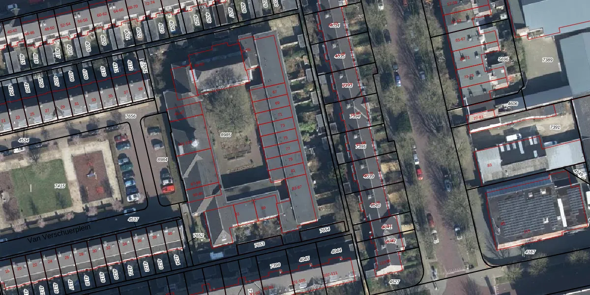 Van Verschuerplein 77 is gelegen op kadastraal perceel AHM01Q8985. Deze kadastrale aanduiding is uniek en wordt gebruikt door het Kadaster om eigendomsrechten en andere zakelijke rechten vast te leggen. Het perceel maakt onderdeel uit van de kadastrale gemeente Arnhem.