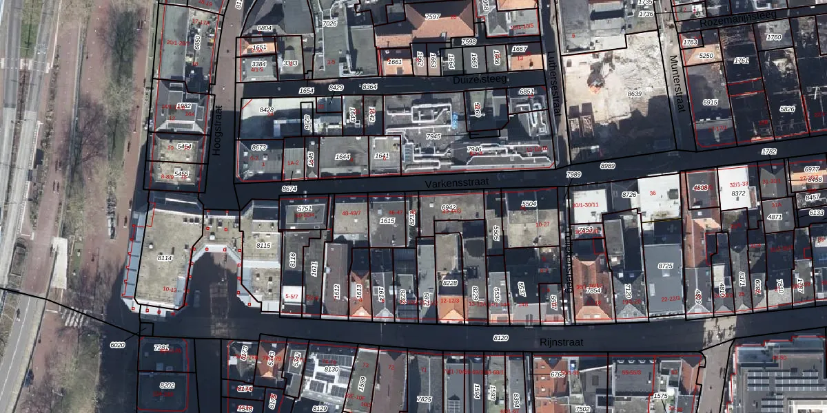 Het perceel waarop Varkensstraat 45 staat heeft een oppervlakte van 41 m². Dit is een klein perceel. De perceeloppervlakte wordt geregistreerd door het Kadaster. Gedetailleerde informatie over de maten van dit perceel kunt u vinden in het rapport Kadastrale kaart met maatvoering van Varkensstraat 45.