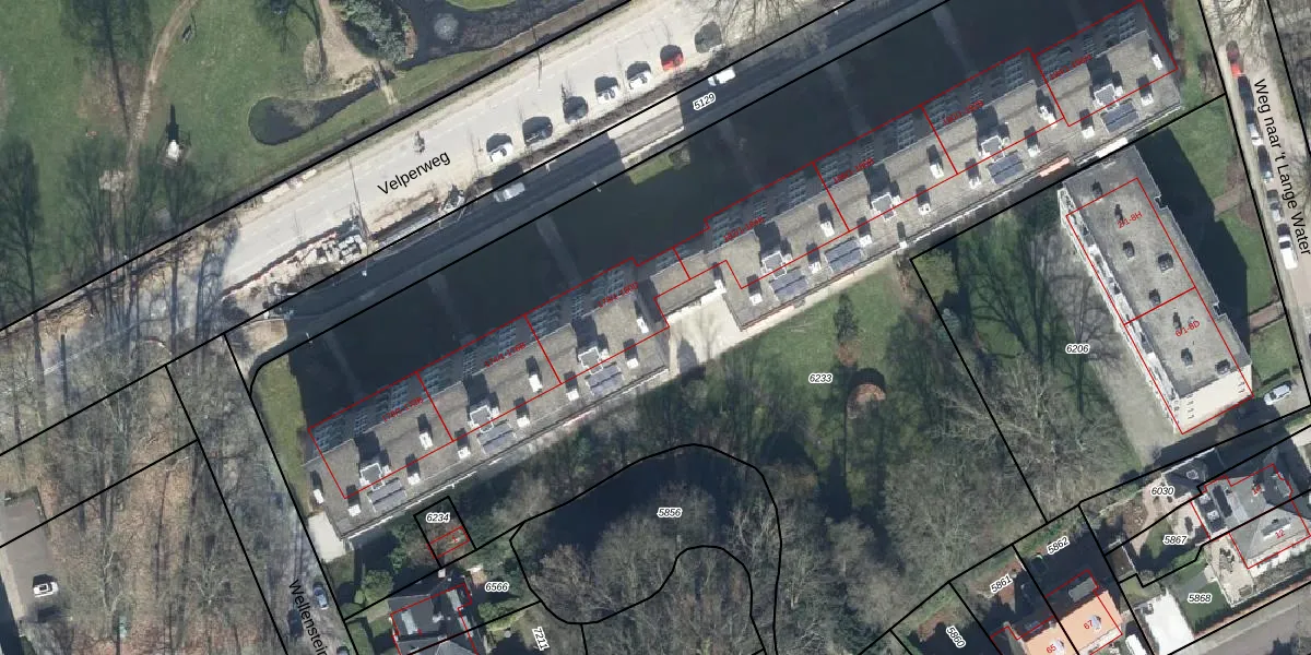 Het perceel waarop Velperweg 180-B staat heeft een oppervlakte van 7345 m². Dit is een zeer groot perceel. De perceeloppervlakte wordt geregistreerd door het Kadaster. Gedetailleerde informatie over de maten van dit perceel kunt u vinden in het rapport Kadastrale kaart met maatvoering van Velperweg 180-B.