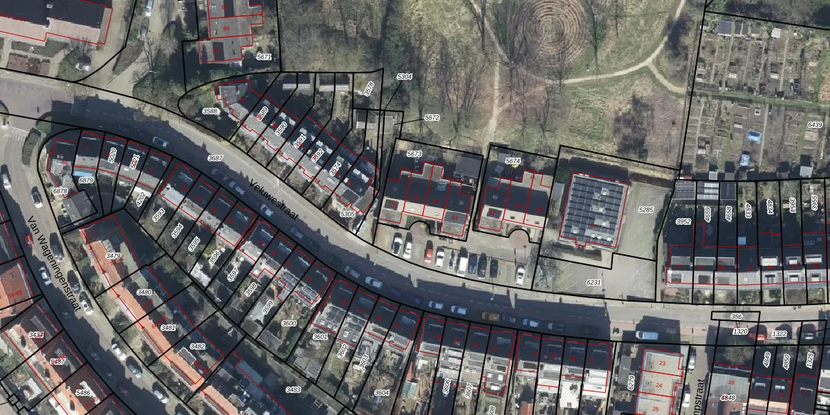 Het perceel waarop Veluwestraat 68 staat heeft een oppervlakte van 448 m². Dit is een groot perceel. De perceeloppervlakte wordt geregistreerd door het Kadaster. Gedetailleerde informatie over de maten van dit perceel kunt u vinden in het rapport Kadastrale kaart met maatvoering van Veluwestraat 68.